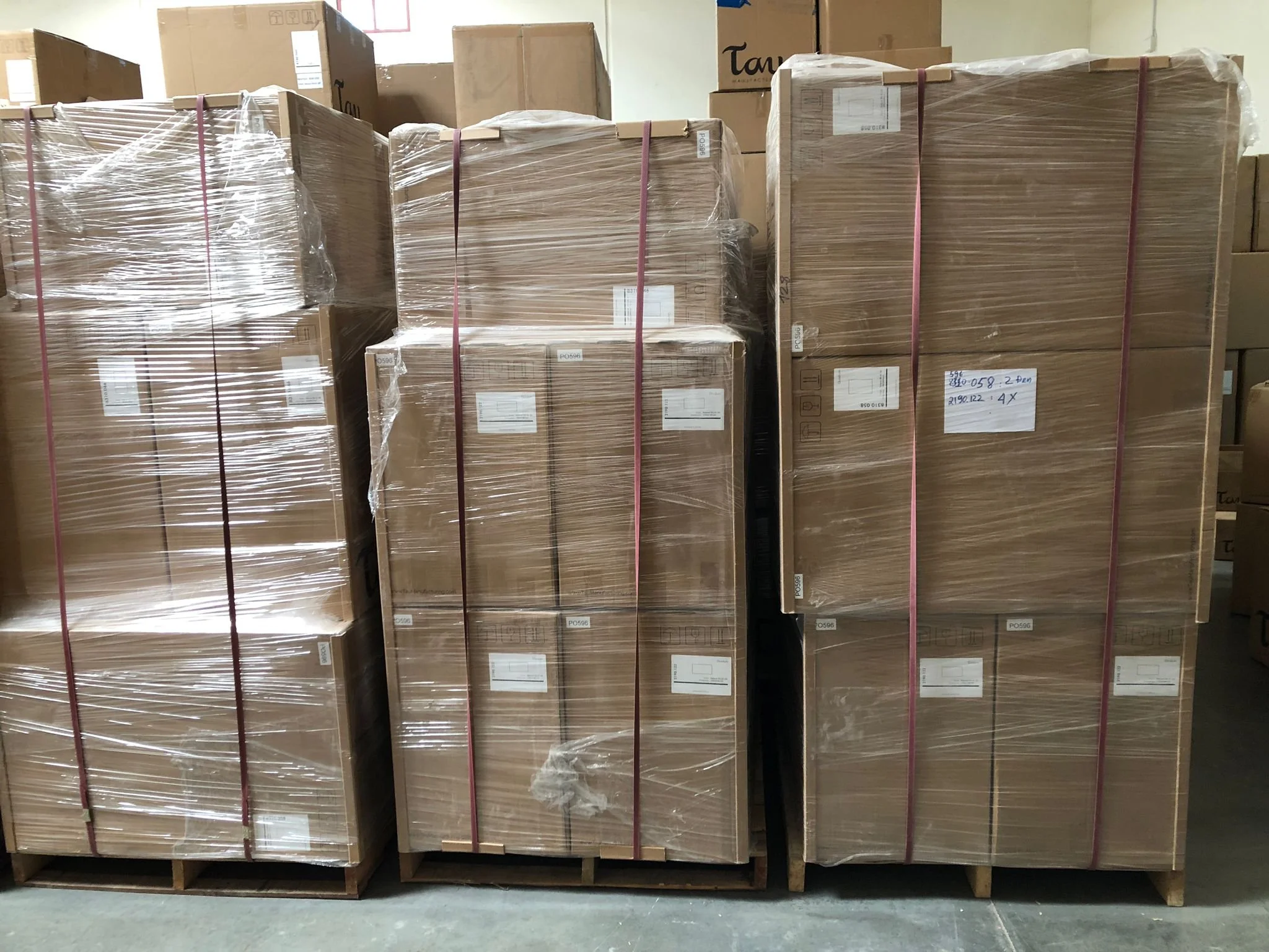 Carton boxes will be loaded into pallets, strapped and wrapped in plastic